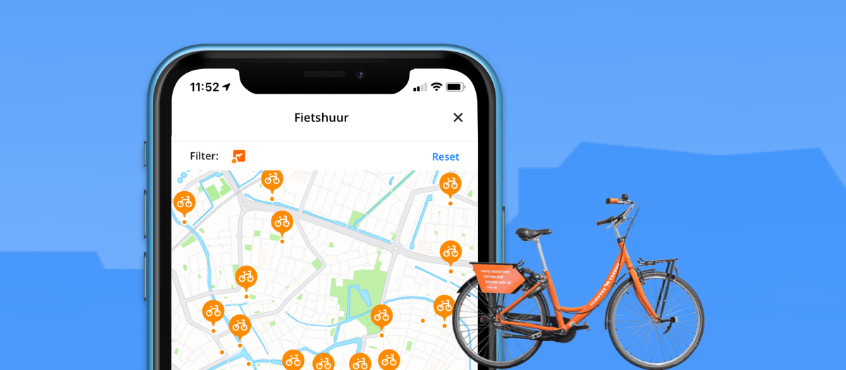 In Nederland fietsen we veel, maar meestal in de buurt van onze woonplaats, omdat je daar een fiets hebt. Deelfietsen hebben de potentie om ons fietsgebruik enorm uit te breiden door mensen in de gelegenheid te stellen overál een fiets te pakken. Op onderstaande kaart zie je bij welke OV-haltes de oranje deelfiets beschikbaar is.